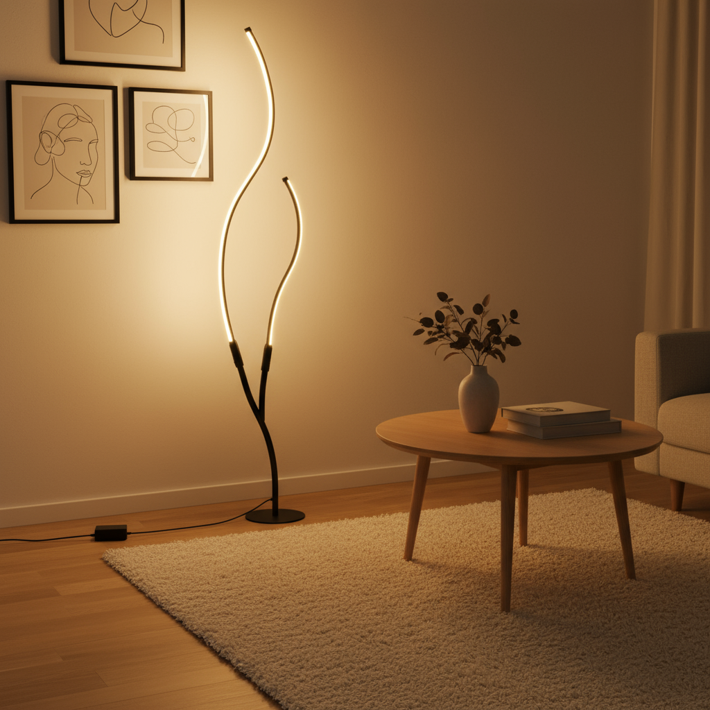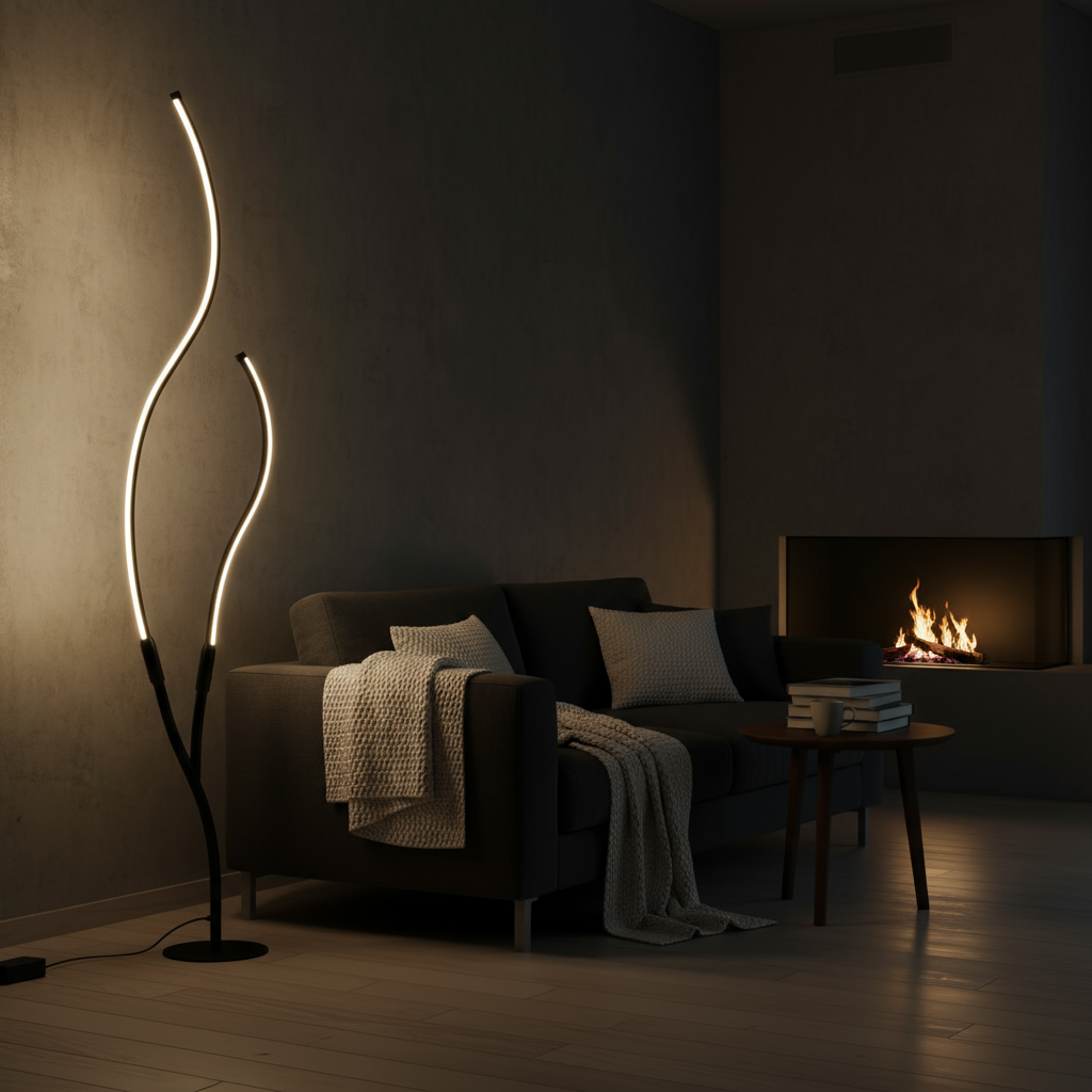 En golvlampa som förenar konstnärlig form och funktionell belysning. Den böljande siluetten skapar ett elegant uttryck och ett varmt sken som lyfter atmosfären i rummet.